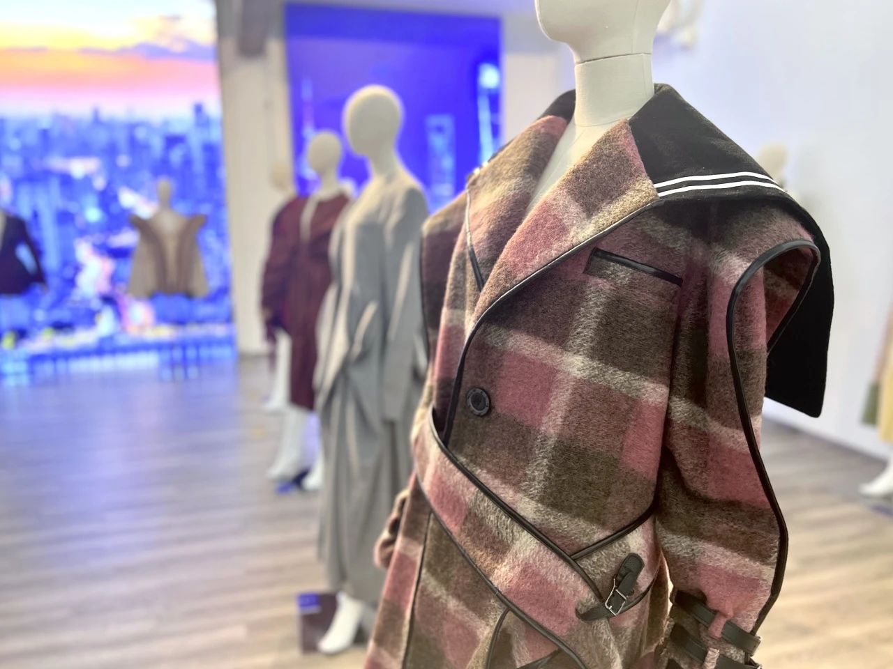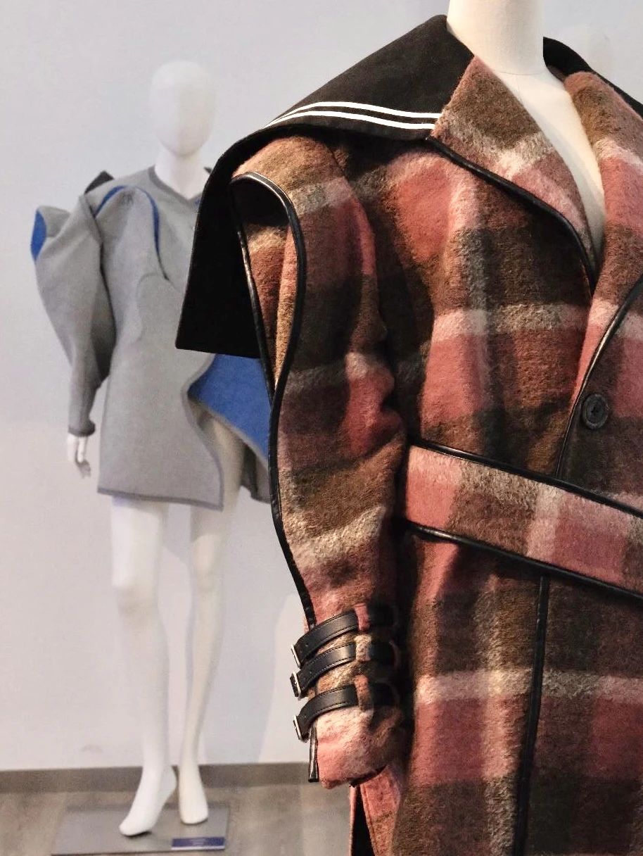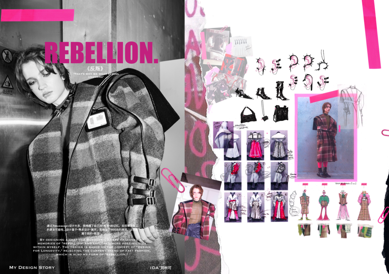 (服装创意设计作品《Rebellion》) “我的作品《rebellion》就是对制服的一次探索与解构。作品将博柏利经典格纹大衣元素与水手制服的经典结构相结合;将代表规则与统一性的校服和代表叛逆与个性的朋克相结合,试图在传统与现代、规则与自由之间找到一种平衡,去触及“延续经典,推陈出新”的项目内核。不盲从潮流,重塑经典纹样与款式,是对“隽永设计”回应,也是当代年轻人的时尚哲学。”SCF学院服装创意设计专业的学生刘秋可介绍道。