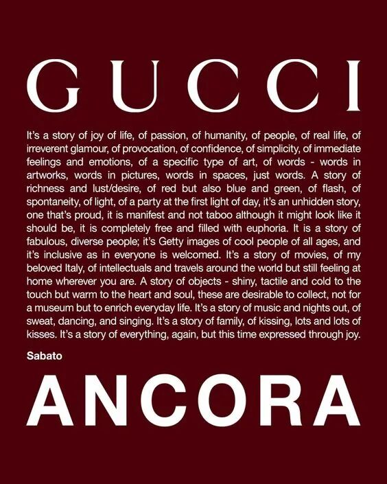 古驰 (Gucci) 于1921年创立于佛罗伦萨,为全球领先精品品牌之一。继品牌创立百年纪念之后,古驰将继续秉持独特创意、创新精神及精湛的意大利传统工艺,持续革新精品的定义。 古驰隶属于全球高端精品集团——开云集团 (Kering),旗下拥有一系列时装、皮具、珠宝及腕表等知名品牌。 随着诙谐的纪录片《Who is Sabato De Sarno?A Gucci Story》放映完毕,在场各位已经被Sabato De Sarno的人格魅力所折服。 “首先要热爱这个行业,不要挑剔,什么都要学,如果你心中有梦想,这样才能把你的梦想变成现实。”