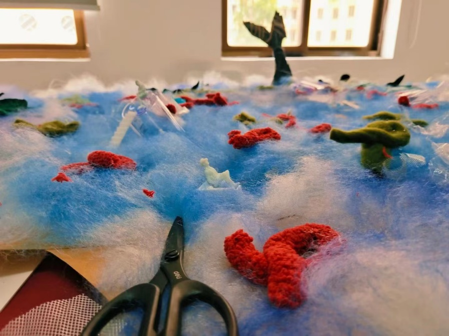 学生们以艺术装置和服装服饰表达自己对海洋环境的感悟与思考。通过调研与创作,他们揭示了海洋污染对食物链的影响,特别是牛仔布生产对水质的破坏。