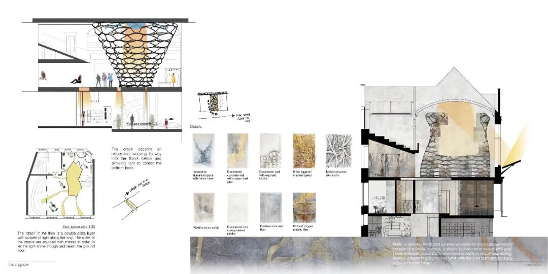 Description:Atelier design for Wen Pan, a young Chinese brand, that focuses on emphasizing the beauty of imperfection. The concept of space is inspired by Japanese philosophy of Kintsugi, an idea that cracks and scars only make an object more precious as it shows its history and identity.