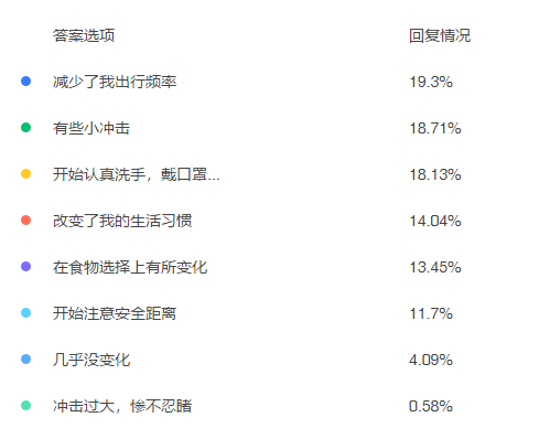 疫情对您的生活有多大影响?19.3%的人认为:疫情对自己的生活有些小冲击;也有很多人开始认真洗手、带口罩,减少了他们的出行频率。在后疫情时代,其中占比比较少的是:13.45%的人在食品选择上有所变化,4.09%认为疫情后的生活几乎没变化。