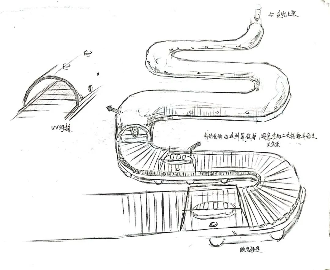 那么为了降低对顾客的影响,我们小组经过讨论希望将这轮时间转接到工作人员身上。也就是采用回转寿司的履带方式,将制作好的食物放在透光罩中,并且在履带的前半段设置足够长的履带和UV灯箱的覆盖,来保证光线的充分消毒。在后半段则依然是由顾客自行选择食物,因为这样的回转方式,顾客在抉择后一般也不会将已经拿出的食物重新放回罩子中,避免了顾客与顾客间可能存在的交叉感染,同时增加了顾客的消费兴趣。